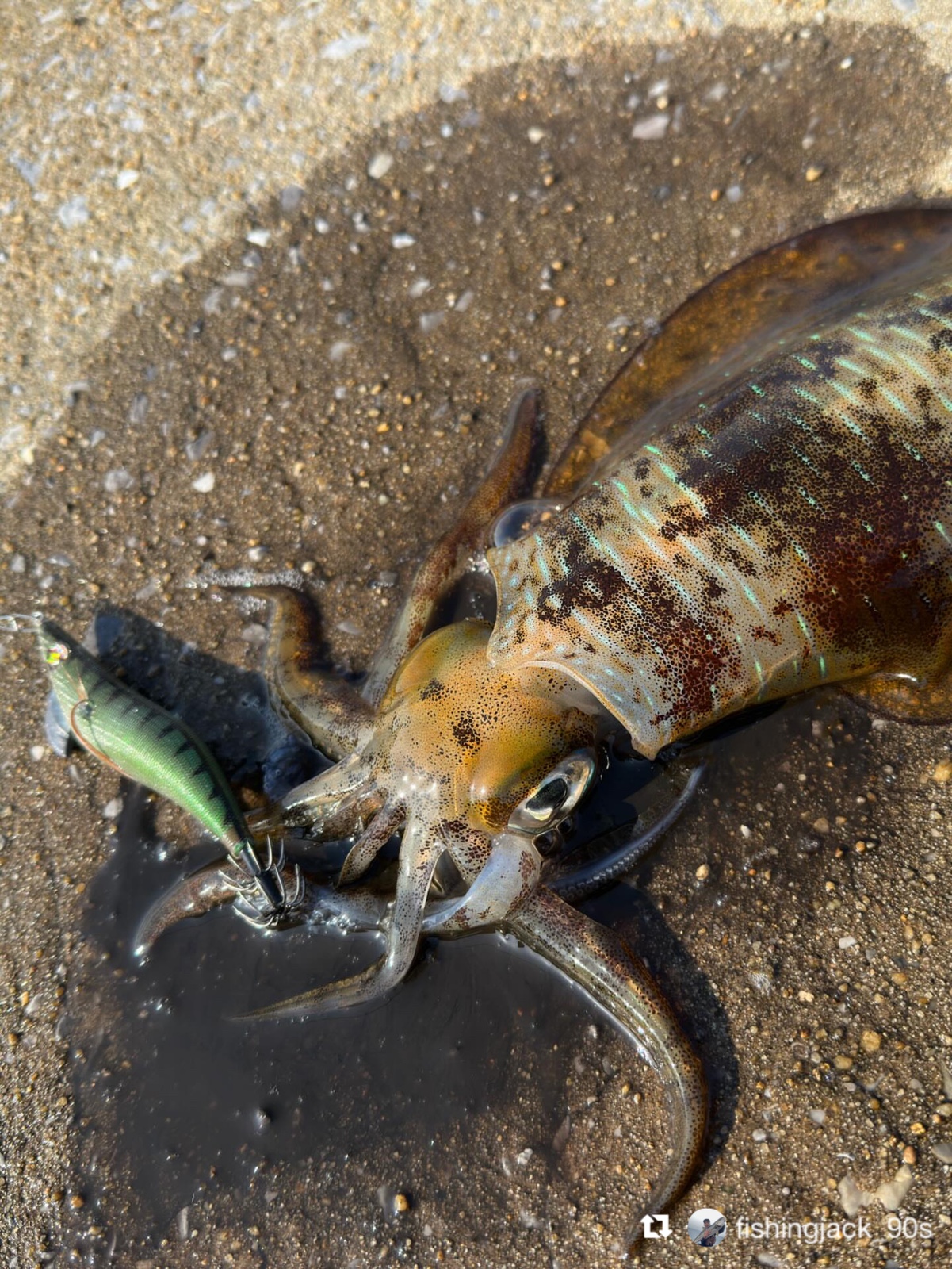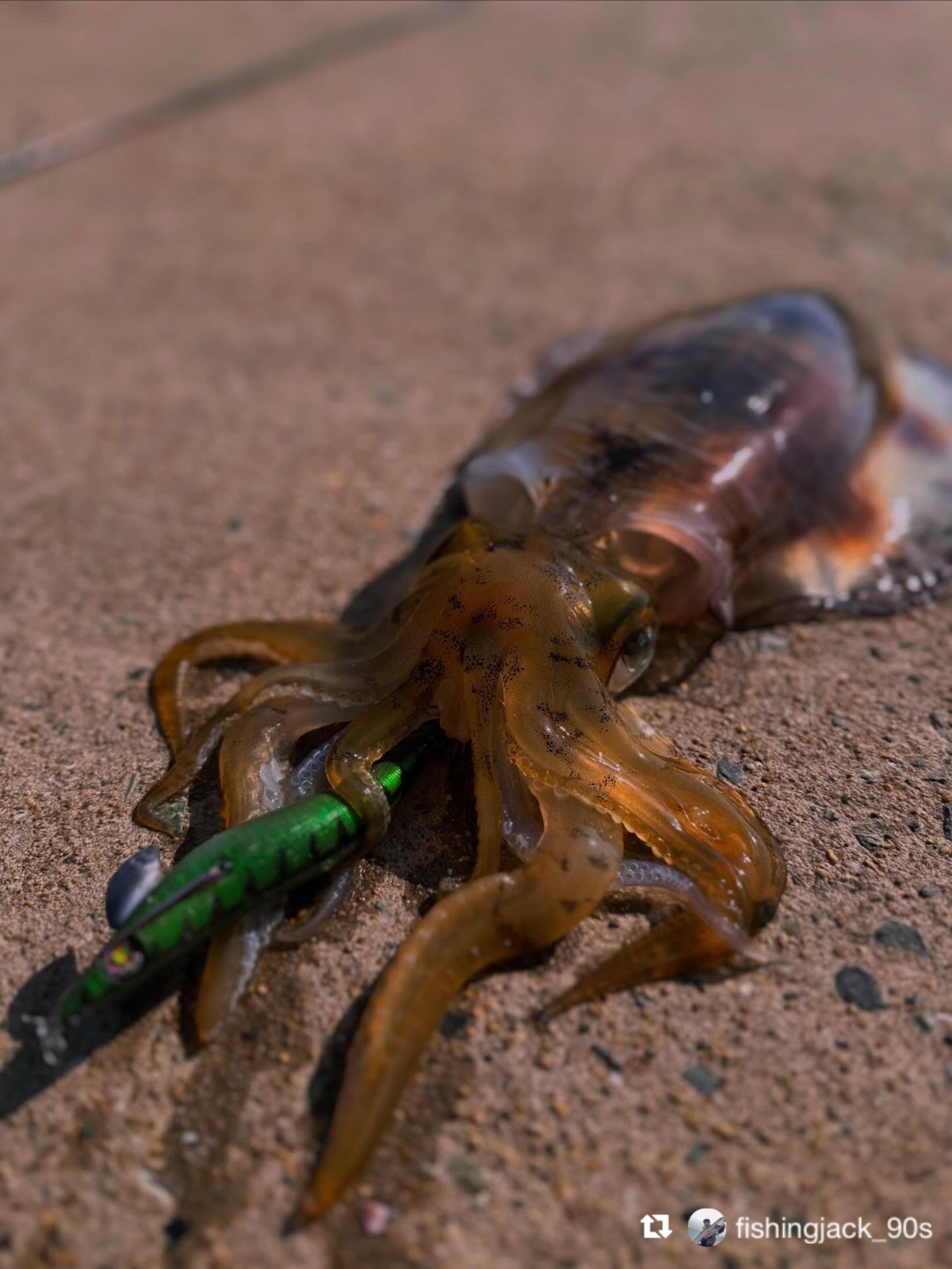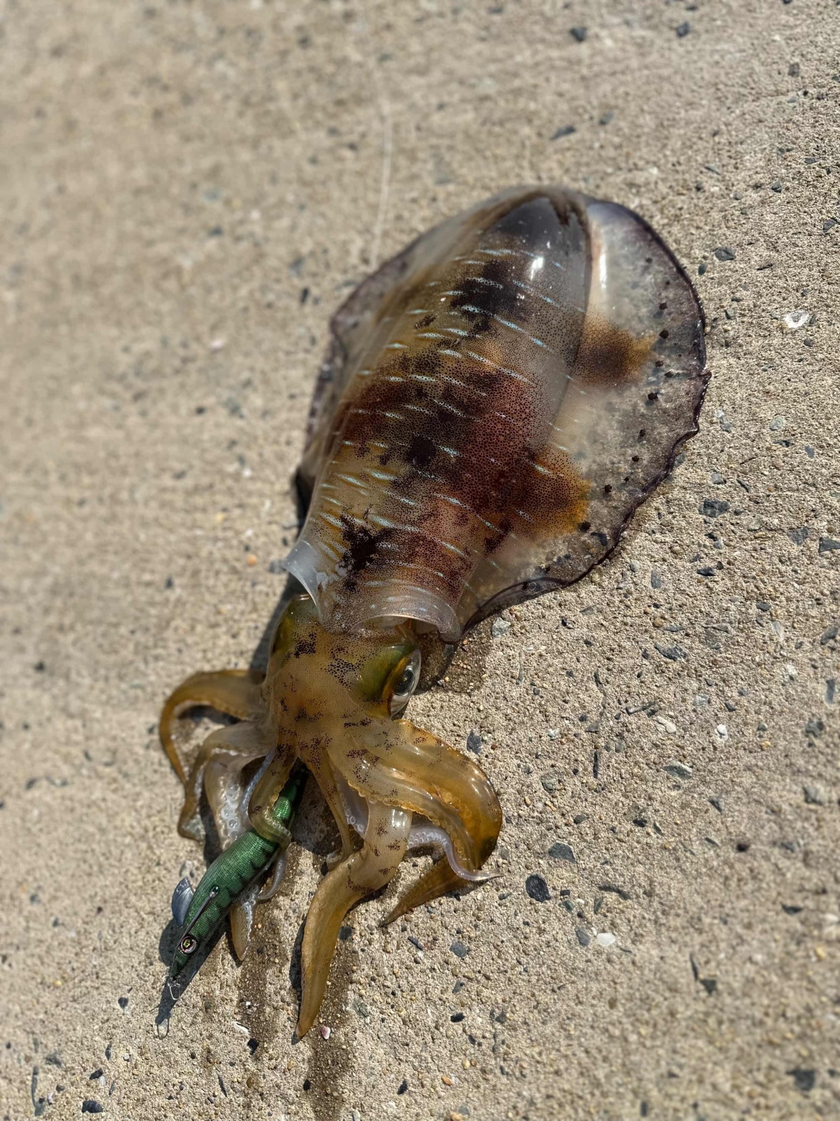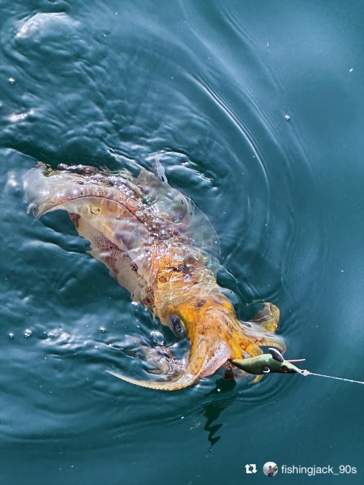 イカがエギに抱きつくと
