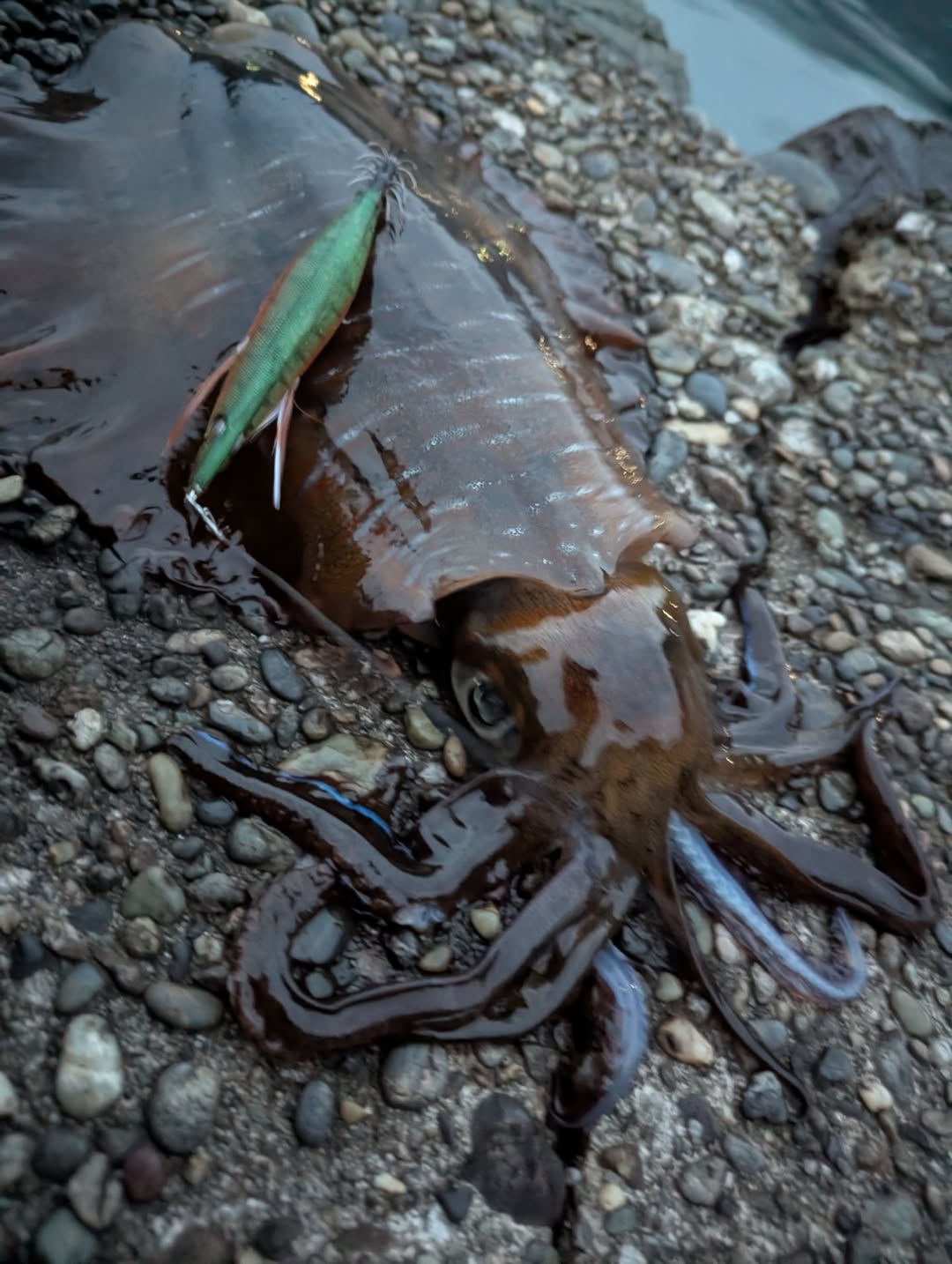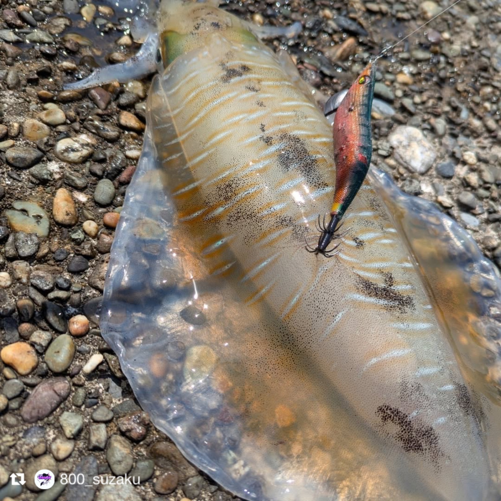 イカがエギに抱きつくと