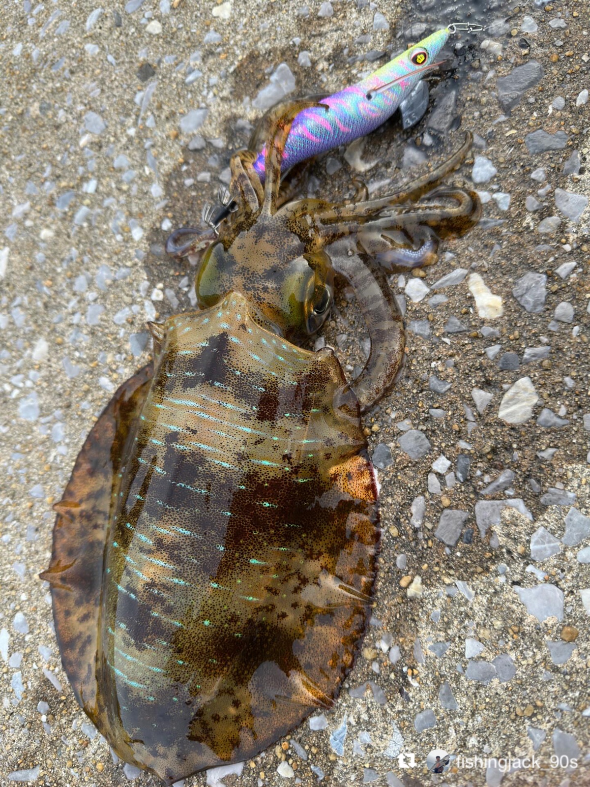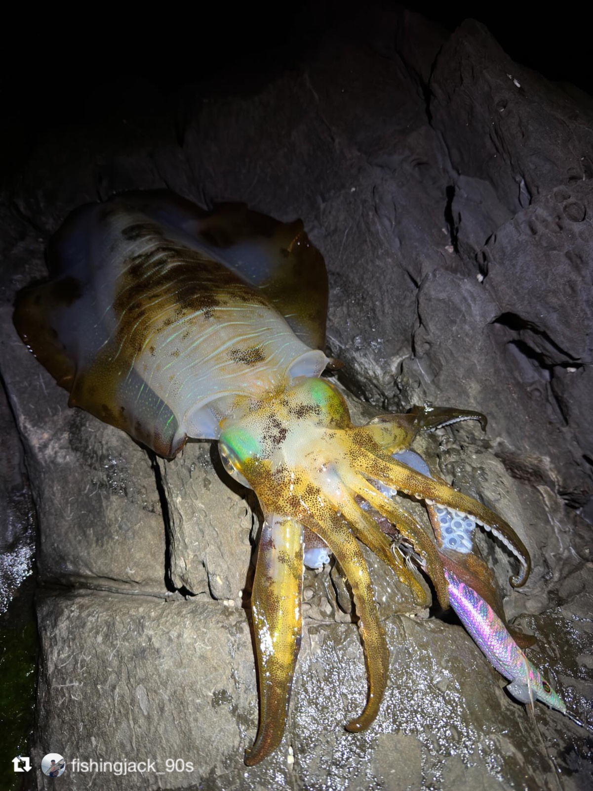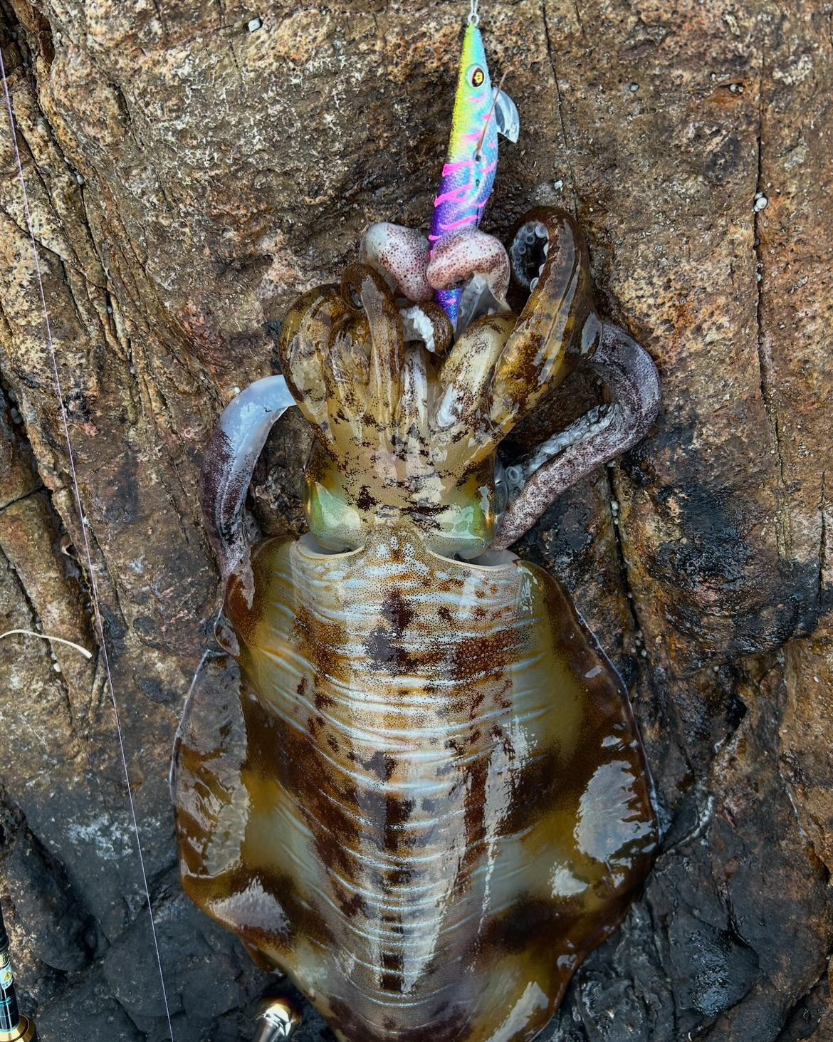 イカがエギに抱きつくと